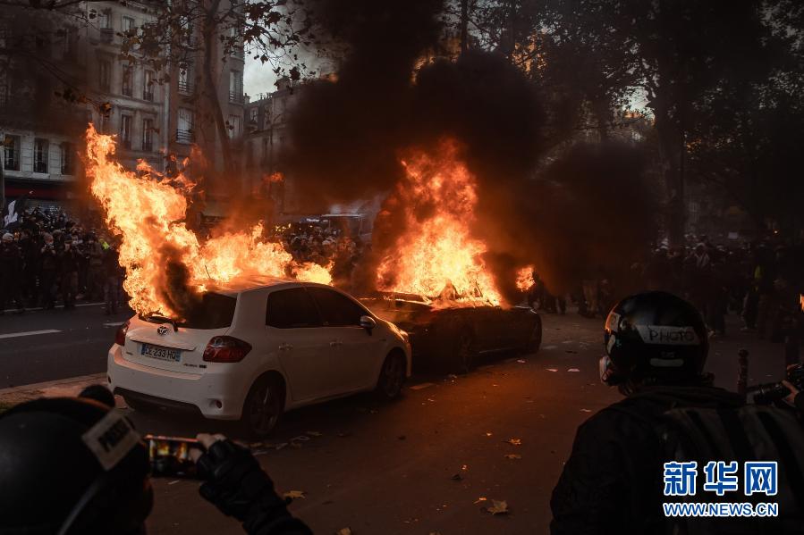 11月28日,在法国巴黎,一名男子在游行示威中被点燃的车辆前自拍。法国包括巴黎在内的多个城市28日发生游行示威,反对涉执法人员法案有关条款和警察暴力执法。警方和示威者在部分游行地点发生冲突,至少46名示威者被逮捕。新华社发(奥雷利安·莫里萨尔摄)