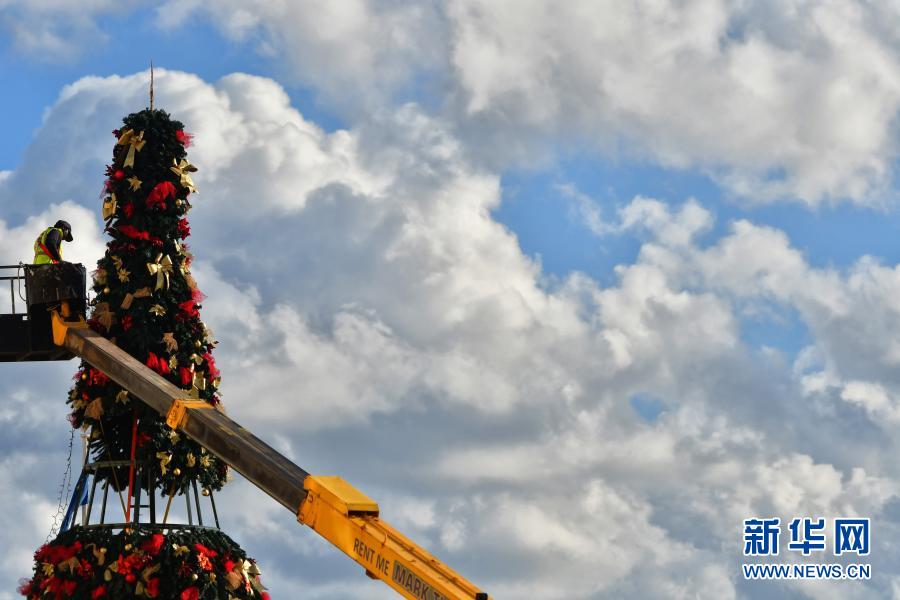 11月29日,一名工人在马耳他首都瓦莱塔装饰位于总理办公室前的一棵巨大圣诞树。受新冠疫情影响,今年马耳他圣诞节将难以再现往年的熙熙攘攘。新华社发(乔纳森·博格摄)