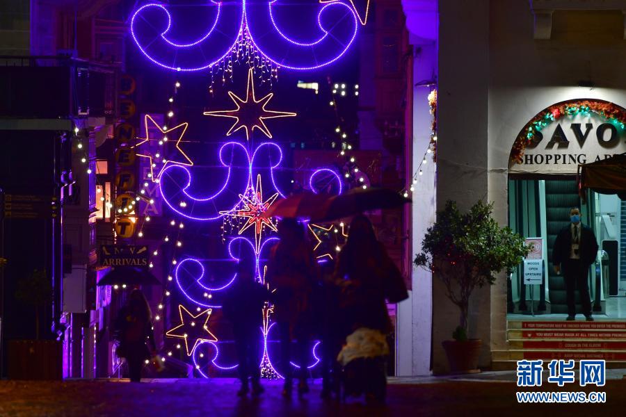 这是11月29日在马耳他首都瓦莱塔拍摄的圣诞灯饰。受新冠疫情影响,今年马耳他圣诞节将难以再现往年的熙熙攘攘。新华社发(乔纳森·博格摄)