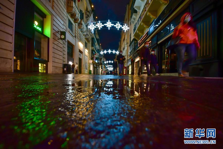 这是11月29日在马耳他首都瓦莱塔拍摄的被圣诞灯饰点亮的街道。受新冠疫情影响,今年马耳他圣诞节将难以再现往年的熙熙攘攘。新华社发(乔纳森·博格摄)