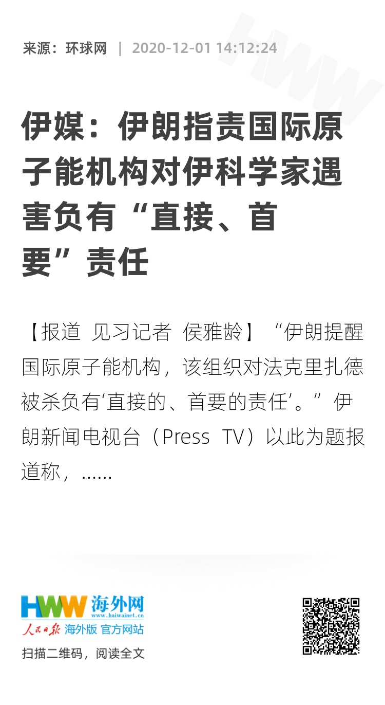 伊朗新闻电视台(Press TV):伊朗提醒国际原子能机构,该组织对法克里扎德被杀负有“直接的、首要的责任”。