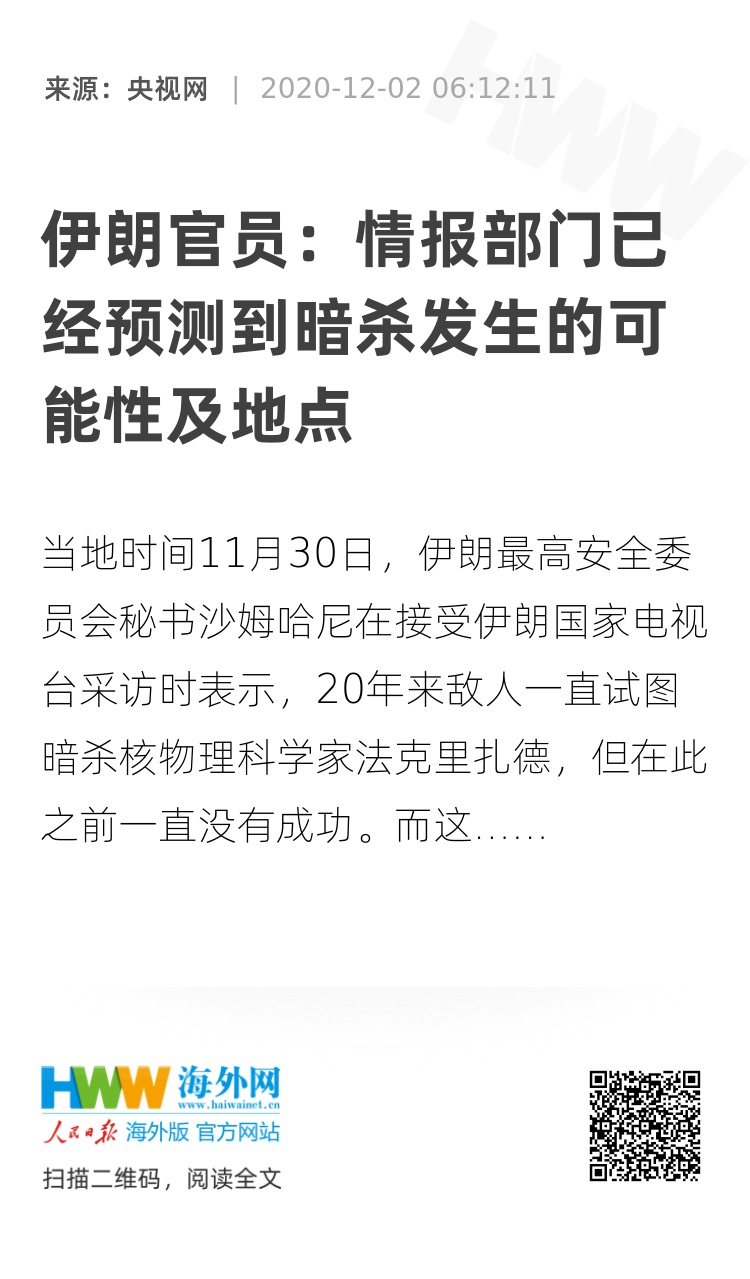另据伊朗官方通讯社伊通社12月1日报道,伊朗政府发言人阿里·拉比埃表示,间谍机构和恐怖组织一直处于伊朗的监控之下,相关部门也预测到了可能发生暗杀的地点,如果时刻遵守安全条款并保持警惕,原本可以阻止这次犯罪行为。此后,安全部门将尽最大努力,优化工作流程来确保这样的悲剧不再重演。