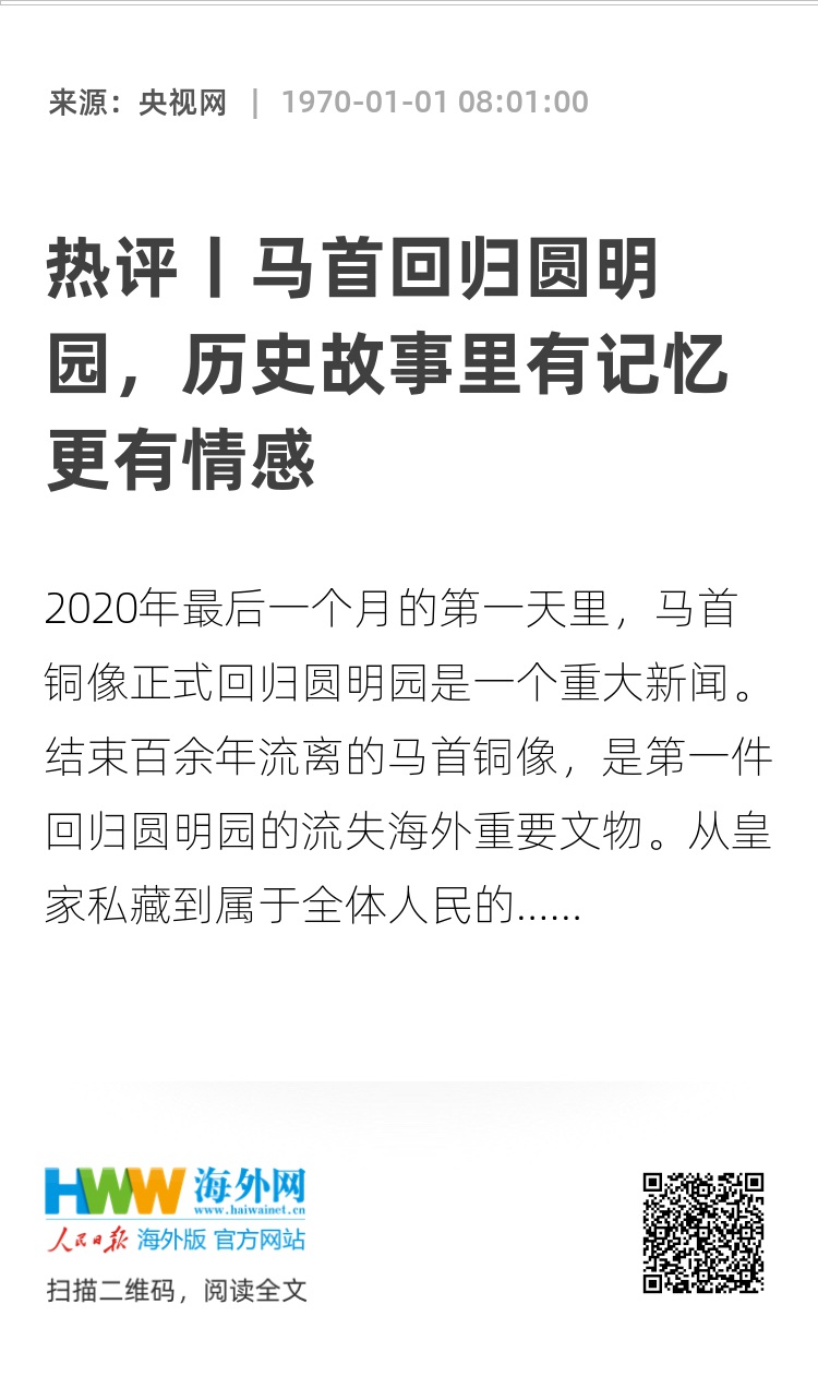 2020年最后一个月的第一天里,马首铜像正式回归圆明园是一个重大新闻。结束百余年流离的马首铜像,是第一件回归圆明园的流失海外重要文物。从皇家私藏到属于全体人民的文化遗产,马首铜像的故事既是一个新时代流失文物回归原属地的成功范例,也是一个增强中华民族凝聚力的契机。