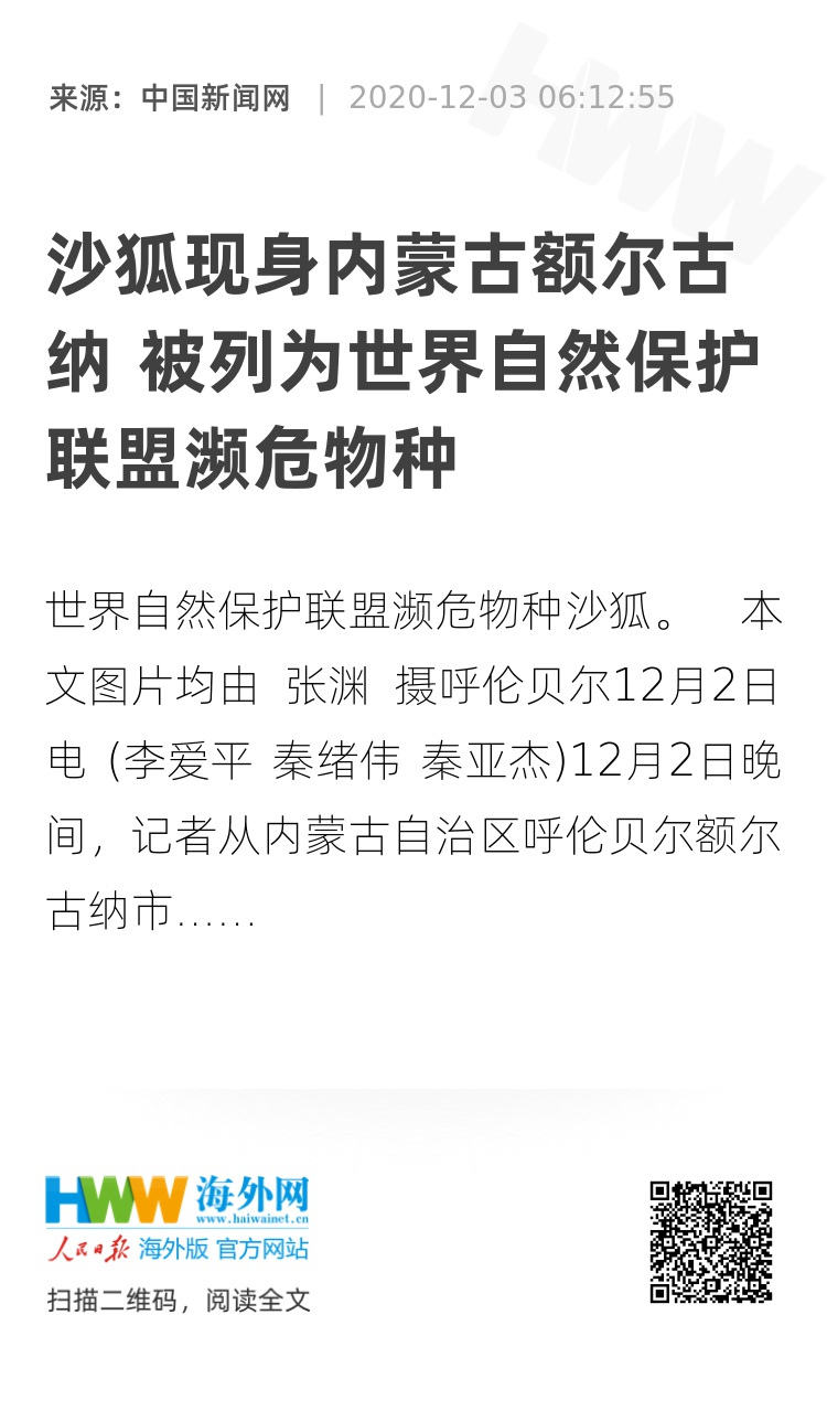 (原题为《内蒙古额尔古纳发现世界自然保护联盟濒危物种沙狐》)