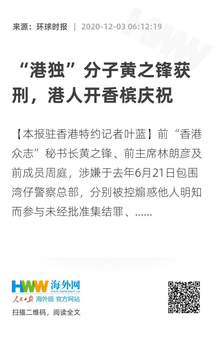 【本报驻香港特约记者叶蓝】前“香港众志”秘书长黄之锋、前主席林朗彦及前成员周庭,涉嫌于去年6月21日包围湾仔警察总部,分别被控煽惑他人明知而参与未经批准集结罪、组织未经批准集结罪及明知而参与未经批准集结罪。案件12月2日在西九龙法院判刑,其中黄之锋被判处入狱13.5个月、周庭入狱10个月、林朗彦入狱7个月,实时监禁。