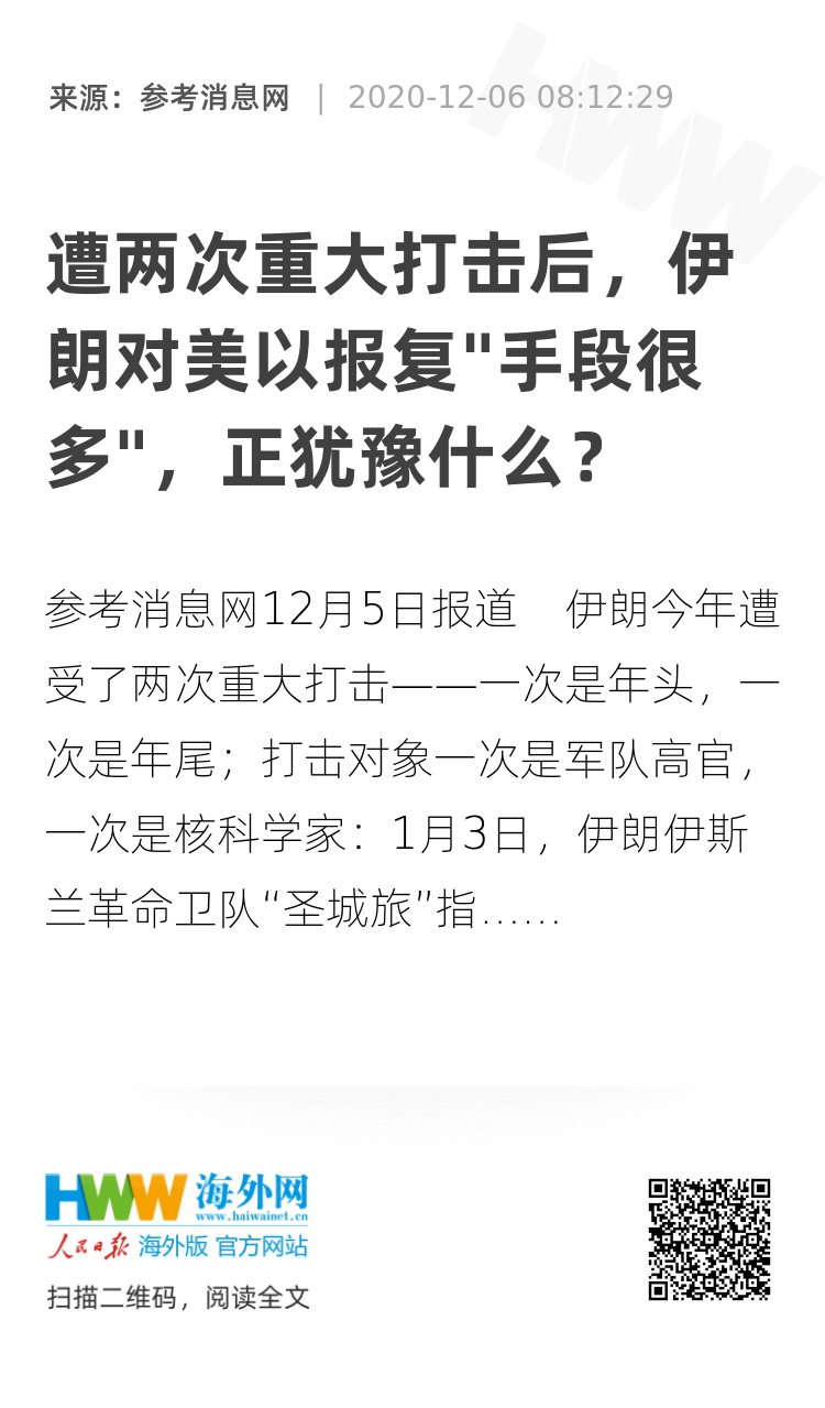 参考消息网12月5日报道 伊朗今年遭受了两次重大打击——一次是年头,一次是年尾;打击对象一次是军队高官,一次是核科学家: