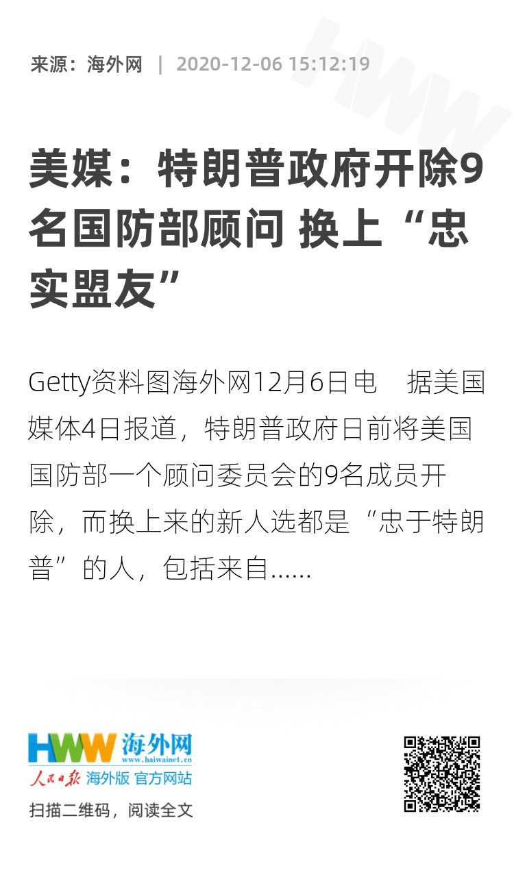 海外网12月6日电 据美国媒体4日报道,特朗普政府日前将美国国防部一个顾问委员会的9名成员开除,而换上来的新人选都是“忠于特朗普”的人,包括来自其竞选团队的亲密盟友。