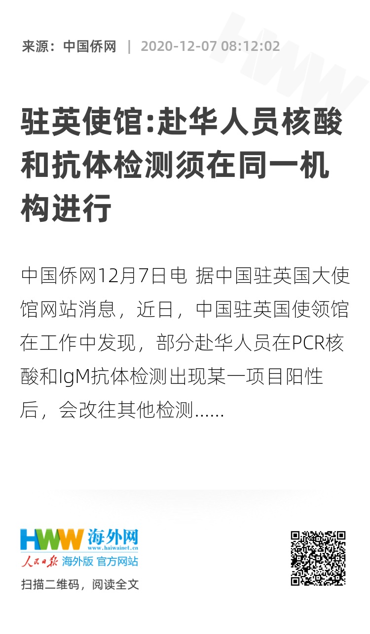 中国驻英国使领馆呼吁赴华旅客在检出核酸或抗体阳性后及时按照英国政府要求进行隔离治疗,待痊愈后再进行检测并申请健康码。同时为保障全体赴华旅客健康安全,维护中英客运航线运行秩序,自12月8日起,中国驻英国使领馆在健康码审核工作中,只接受同一旅客提供的同一机构的核酸和抗体检测报告,并将与有关检测机构核实报告真伪。其它现有要求不变。请12月8日以后(不含当日)赴华的旅客在同一家检测机构进行PCR核酸和IgM抗体检测,并提醒检测机构及时答复使领馆的电话或邮件查询。尤其是航班起飞时间在晚上或非工作日的旅客,务必选择能够在非工作时间进行联系的机构,以免因未能及时核实检测报告的真伪而影响行程。