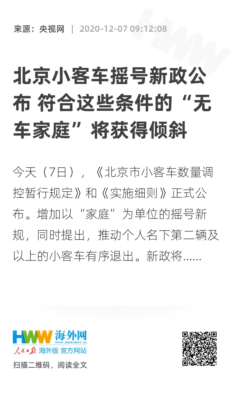 今天(7日),《北京市小客车数量调控暂行规定》和《实施细则》正式公布。增加以“家庭”为单位的摇号新规,同时提出,推动个人名下第二辆及以上的小客车有序退出。新政将于2021年1月1日起正式实施。