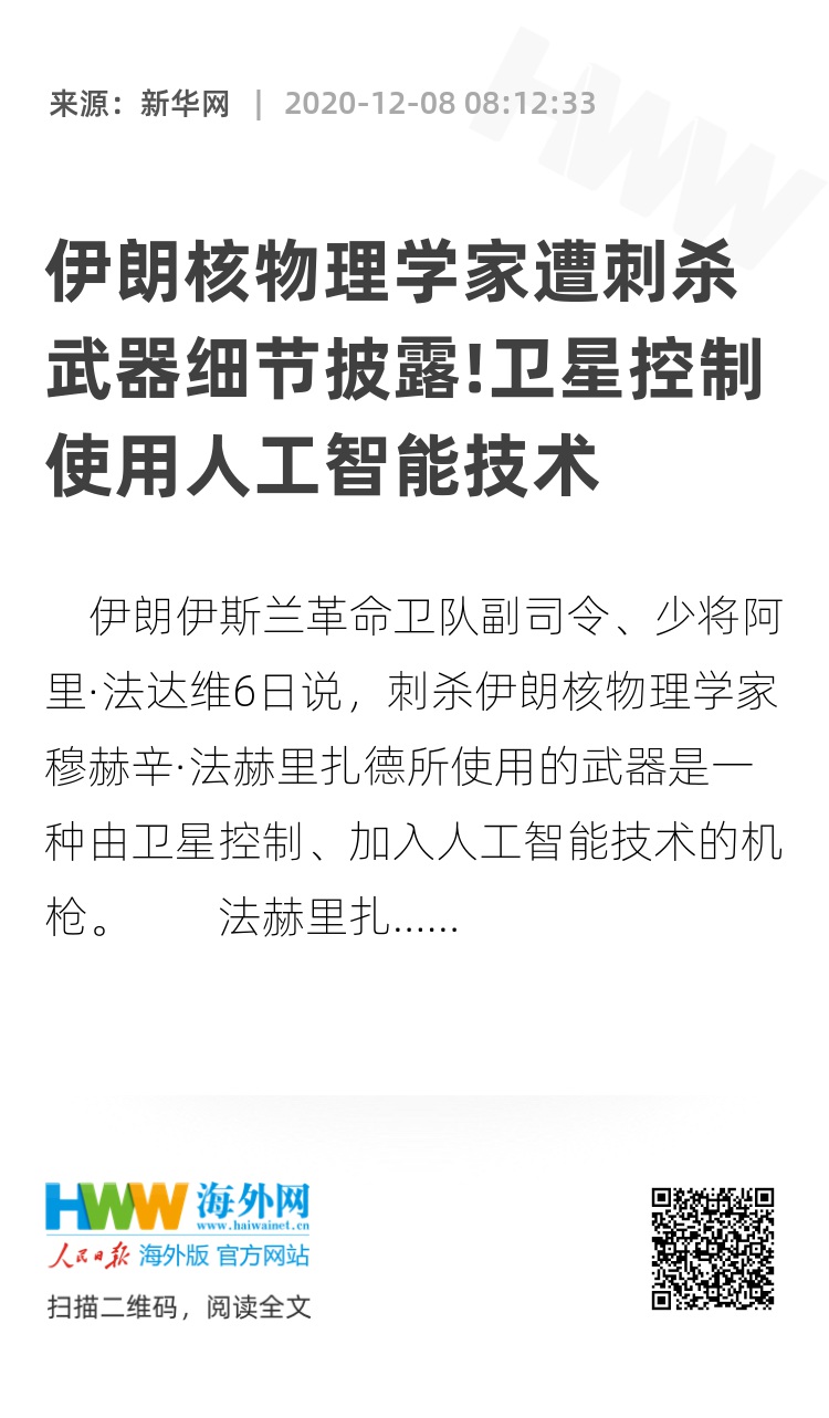 伊朗伊斯兰革命卫队副司令、少将阿里·法达维6日说,刺杀伊朗核物理学家穆赫辛·法赫里扎德所使用的武器是一种由卫星控制、加入人工智能技术的机枪。