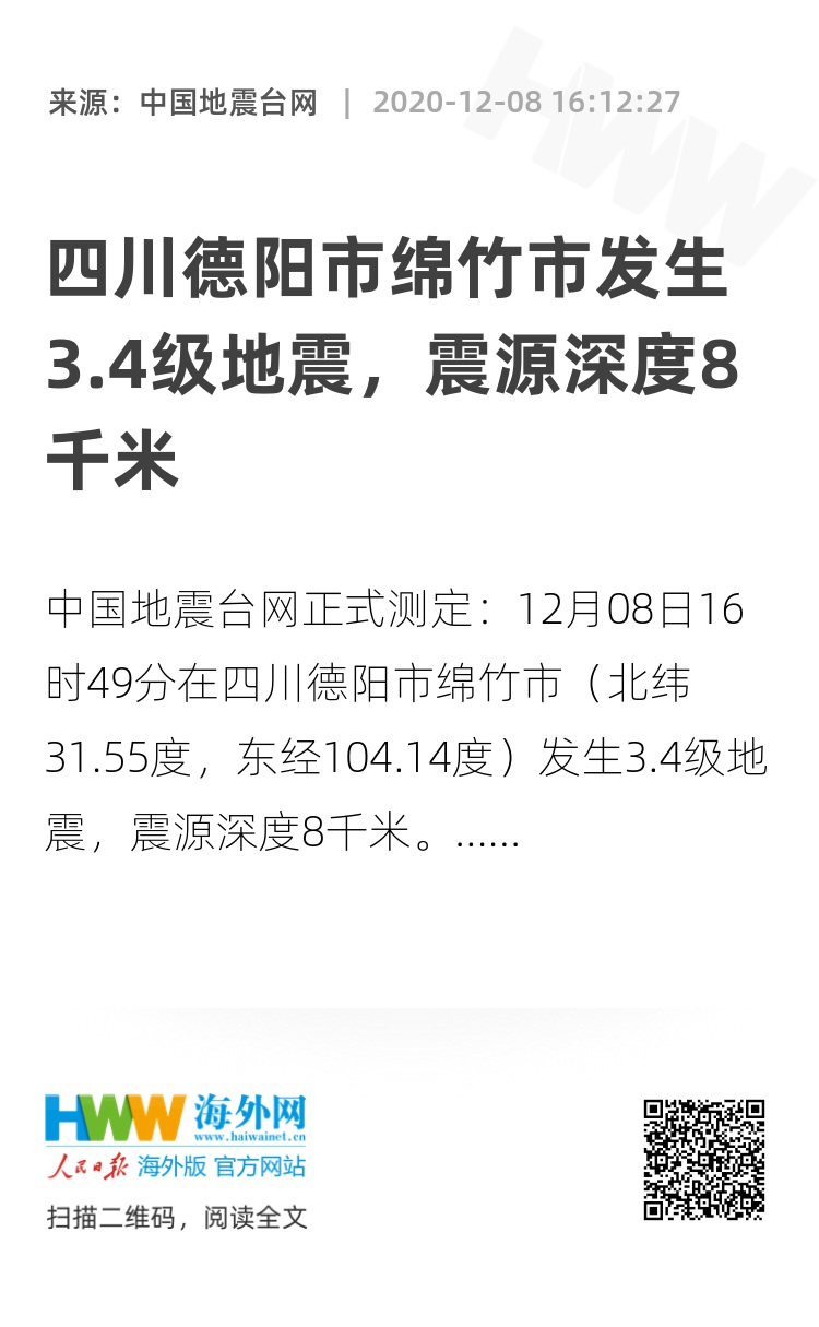 中国地震台网正式测定:12月08日16时49分在四川德阳市绵竹市(北纬31.55度,东经104.14度)发生3.4级地震,震源深度8千米。