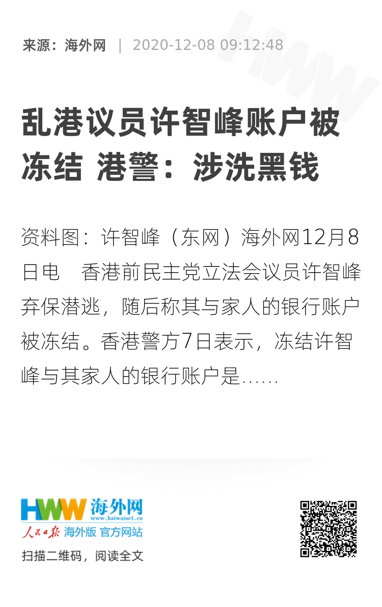 海外网12月8日电 香港前民主党立法会议员许智峰弃保潜逃,随后称其与家人的银行账户被冻结。香港警方7日表示,冻结许智峰与其家人的银行账户是因为怀疑有关人士挪用85万港元众筹款项,涉洗黑钱或犯罪得益。