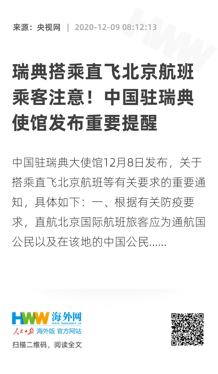 中国驻瑞典大使馆12月8日发布,关于搭乘直飞北京航班等有关要求的重要通知,具体如下: