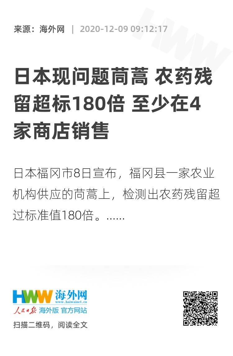 海外网12月9日电 日本福冈市8日宣布,福冈县一家农业机构供应的苘蒿上,检测出农药残留超过标准值180倍。如果食用,可能引发胃痉挛、呕吐等,目前正从销售店铺进行紧急回收。