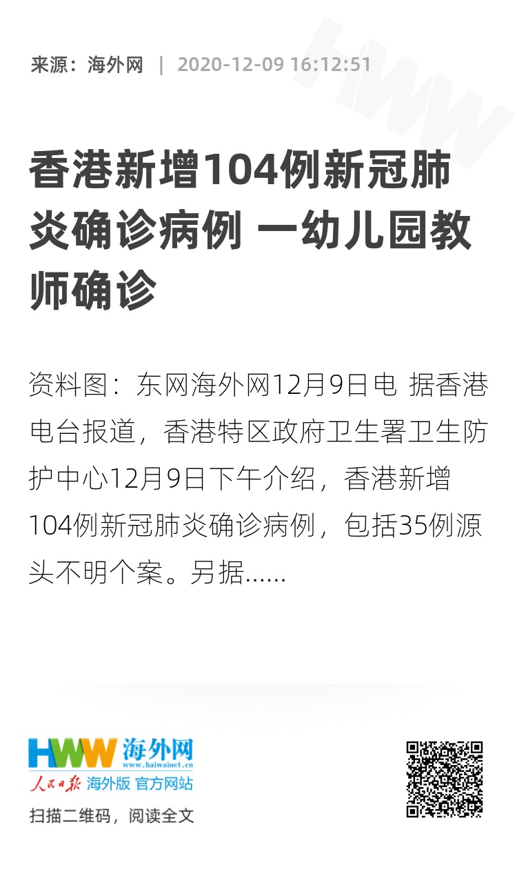 海外网12月9日电 据香港电台报道,香港特区政府卫生署卫生防护中心12月9日下午介绍,香港新增104例新冠肺炎确诊病例,包括35例源头不明个案。