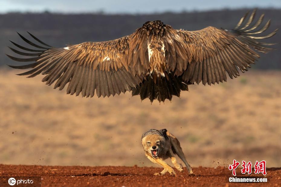 2020年12月11日报道(具体拍摄时间不详),南非辛安佳私人动物保护区,42岁的野生动物摄影师Seyms Brugger拍摄到一系列动物猎食的精彩画面,一群豺狼与秃鹫上演夺食大战。Seyms称豺狼是非常聪明的掠食者,当它们有觅食机会时总会靠近秃鹫。图片来源:东方IC 版权作品 请勿转载