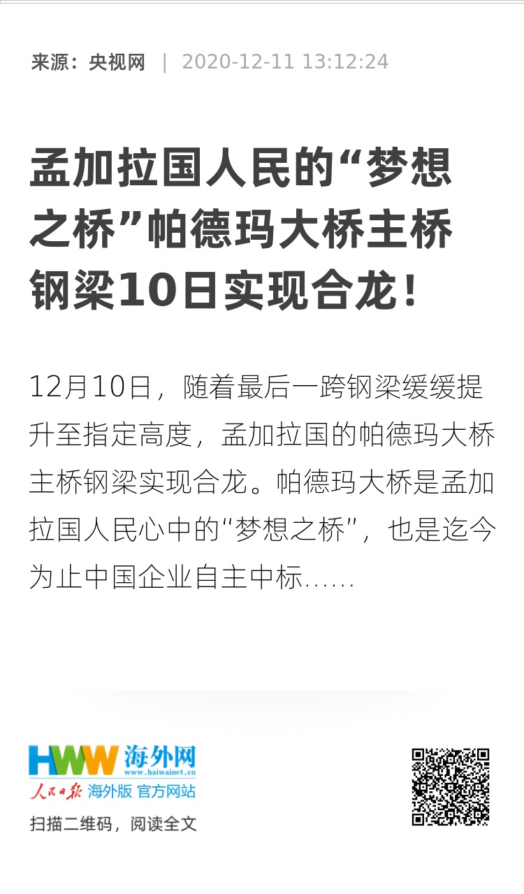 12月10日,随着最后一跨钢梁缓缓提升至指定高度,孟加拉国的帕德玛大桥主桥钢梁实现合龙。帕德玛大桥是孟加拉国人民心中的“梦想之桥”,也是迄今为止中国企业自主中标的最大国际桥梁项目。