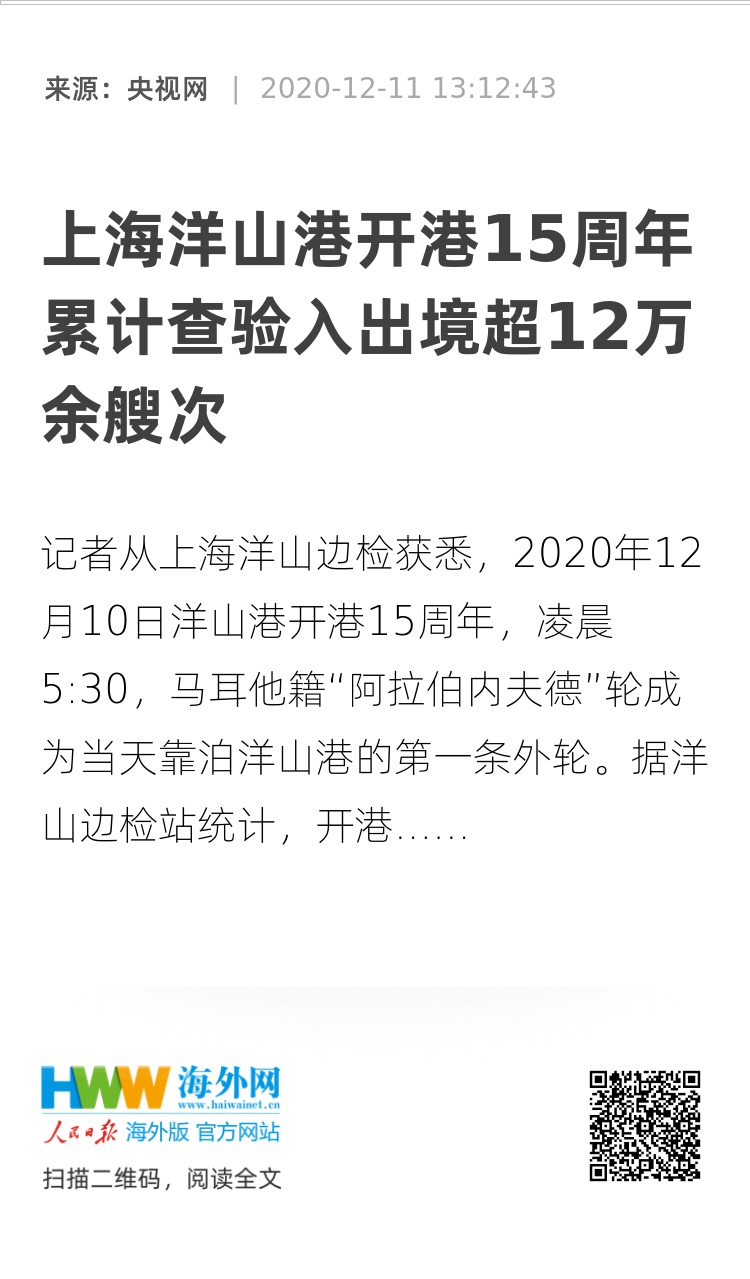 记者从上海洋山边检获悉,2020年12月10日洋山港开港15周年,凌晨5:30,马耳他籍“阿拉伯内夫德”轮成为当天靠泊洋山港的第一条外轮。据洋山边检站统计,开港以来该站累计查验入出境(港)船舶12.07万余艘次,入出境(港)人员2863.6万余人次,累计1.97亿多个集装箱在这里吞吐中转,当年的小渔村已成长为世纪大港,跻身世界强港之列。