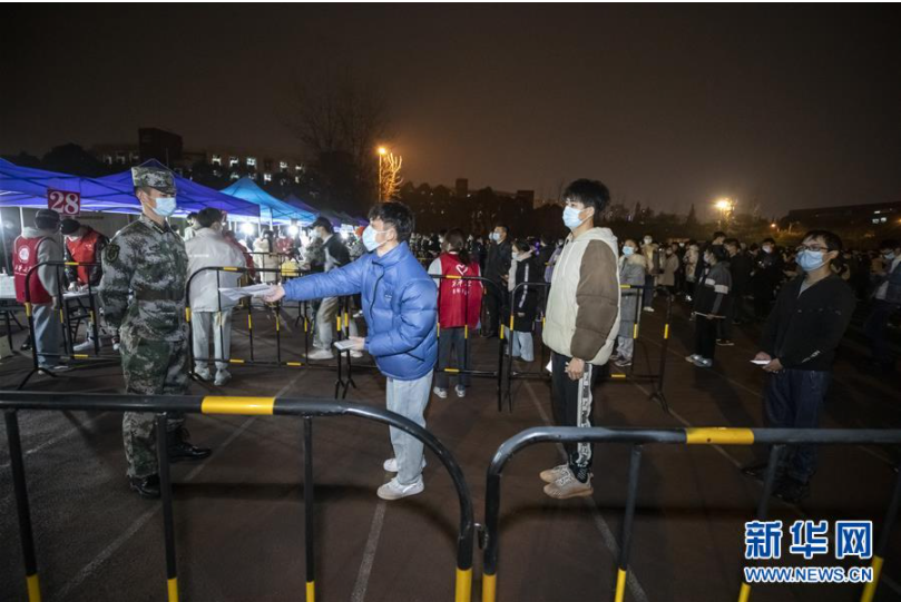 12月11日晚,在位于四川成都市郫都区的西华大学本部,学生在操场上排队准备进行核酸检测。 当日,成都市郫都区新型冠状病毒肺炎疫情防控指挥部发布通告,从2020年12月11日18点00分开始,全面开展郫都区全员新冠肺炎疫情核酸检测,确保不漏一人。检测费用由区政府承担。 新华社记者 沈伯韩 摄