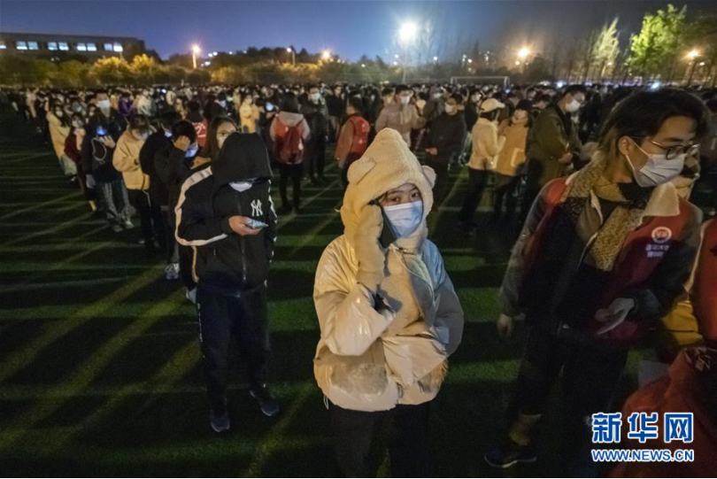 12月11日晚,在位于四川成都市郫都区的西华大学本部,学生在操场上排队准备进行核酸检测。 当日,成都市郫都区新型冠状病毒肺炎疫情防控指挥部发布通告,从2020年12月11日18点00分开始,全面开展郫都区全员新冠肺炎疫情核酸检测,确保不漏一人。检测费用由区政府承担。 新华社记者 沈伯韩 摄