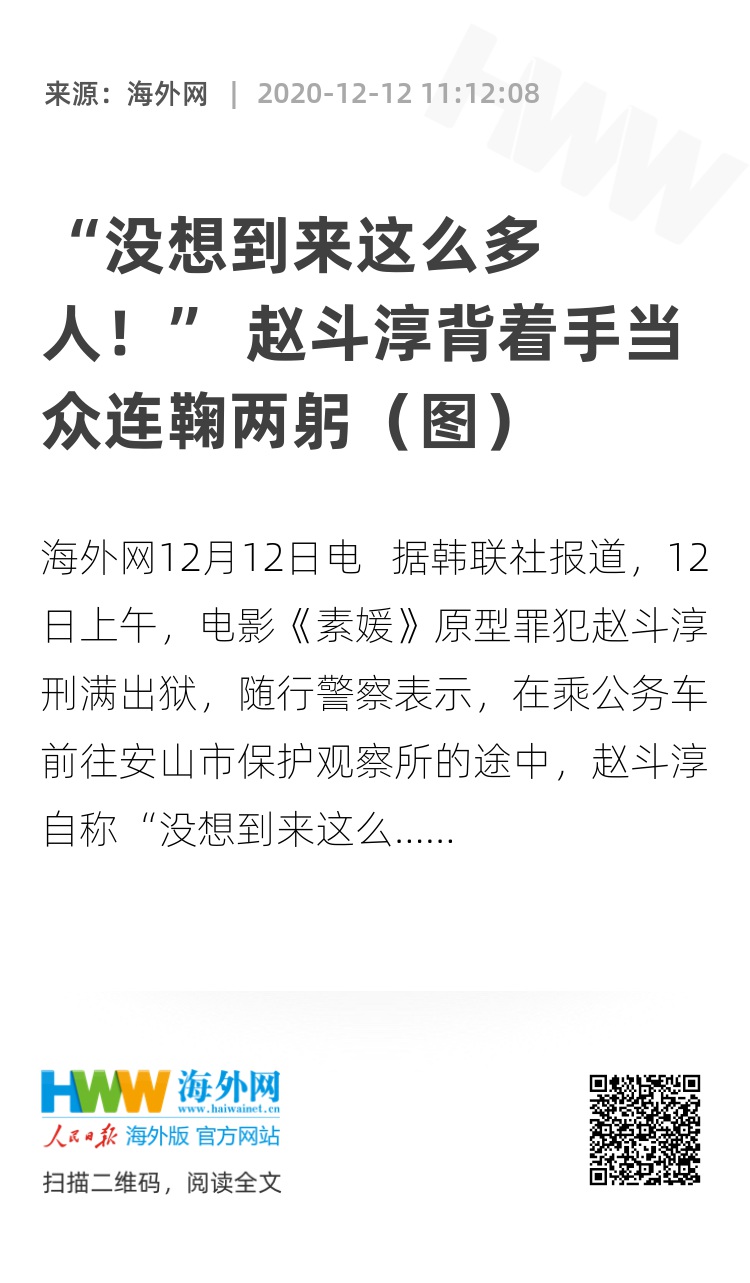 海外网12月12日电 据韩联社报道,12日上午,电影《素媛》原型罪犯赵斗淳刑满出狱,随行警察表示,在乘公务车前往安山市保护观察所的途中,赵斗淳自称“没想到来这么多人”,还说自己犯了“天怒人怨的错误”,承诺要反省地去生活。