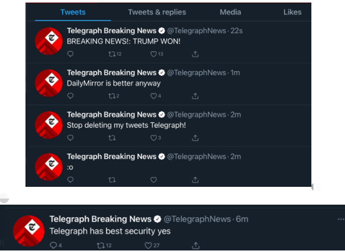 【环球网报道 记者 张晓雅】“突发新闻!特朗普赢了!”英国《每日电讯报》推特账号当地时间12日晚的这条“爆炸性”消息引起不少人注意。不过,很快有媒体发现,《每日电讯报》账号被黑了……