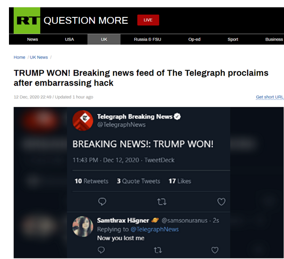 (RT:尴尬被黑后,《每日电讯报》突发新闻推送消息宣布:“特朗普赢了”! )