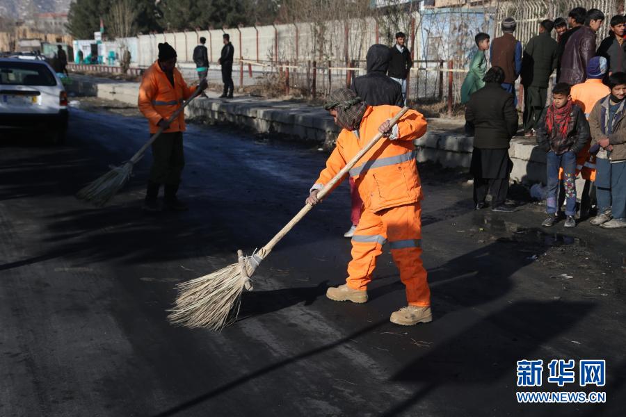 12月12日,在阿富汗喀布尔,市政工人清理火箭弹袭击后的地面。当日,阿富汗首都喀布尔遭到多枚火箭弹袭击,袭击造成至少1人死亡。新华社发(赛义德摄)