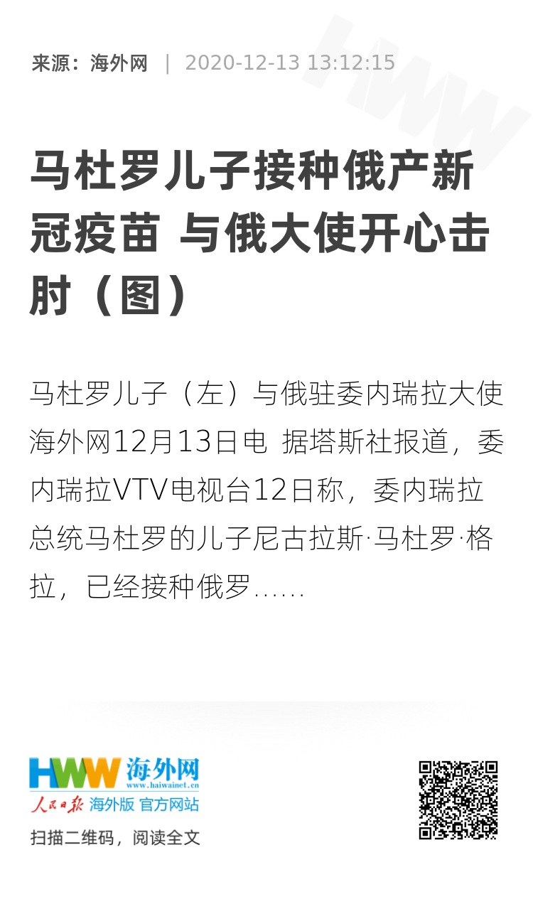 报道说,俄罗斯驻委内瑞拉大使谢尔盖∙梅利克-巴格达萨罗夫出席了疫苗接种仪式,并表示马杜罗·格拉在接种后“感觉非常棒”。俄驻委内瑞拉大使馆还在推特上发布了巴格达萨罗夫与马杜罗·格拉微笑击肘的照片。(海外网 刘强)