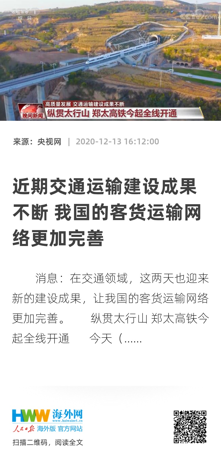 央视网消息:在交通领域,这两天也迎来新的建设成果,让我国的客货运输网络更加完善。