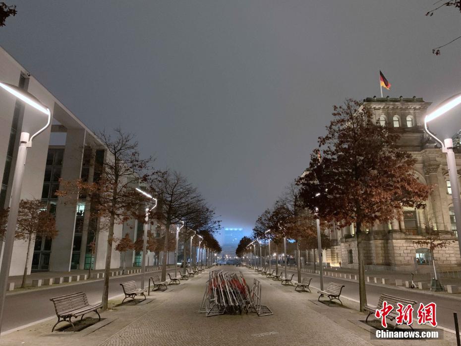 12月13日,由于新冠疫情持续恶化,德国总理默克尔紧急与各州州长召开会议并作出决议,从本月16日起至明年1月10日将目前的“部分封城”升级为“硬性封城”。在此期间,除食品超市外的大部分零售业商铺都必须关闭,中小学幼儿园也将停课,圣诞节期间每个家庭聚会人数将受到严格限制。图为13日晚,柏林国会大厦旁一条往日游人和锻炼者较多的街道如今变得空空荡荡。 中新社记者 彭大伟 摄