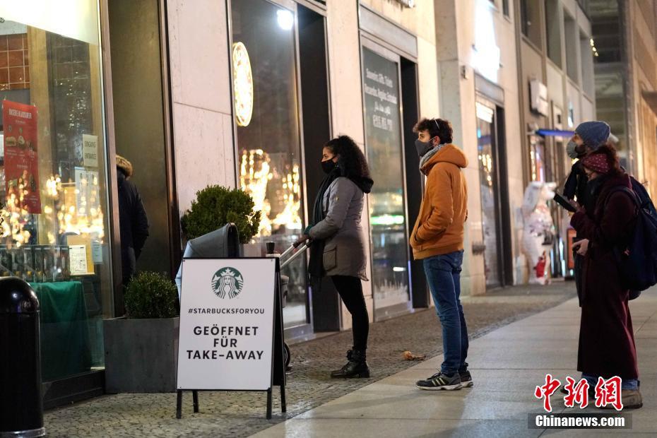 12月13日,由于新冠疫情持续恶化,德国总理默克尔紧急与各州州长召开会议并作出决议,从本月16日起至明年1月10日将目前的“部分封城”升级为“硬性封城”。在此期间,除食品超市外的大部分零售业商铺都必须关闭,中小学幼儿园也将停课,圣诞节期间每个家庭聚会人数将受到严格限制。图为13日晚,柏林一家星巴克咖啡外排队等候入内的人。 中新社记者 彭大伟 摄