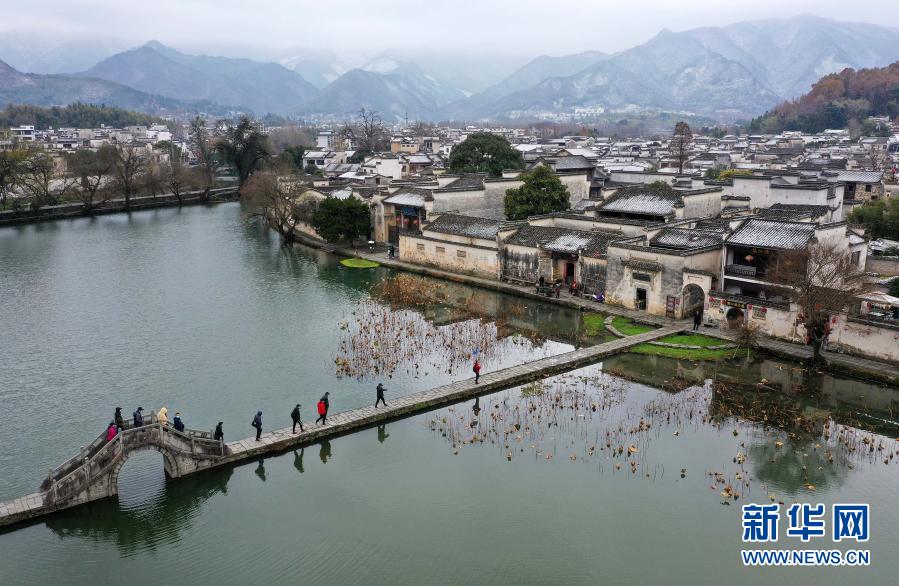 12月14日,游人在雪后的安徽黄山黟县宏村游玩(无人机航拍)。在安徽省黄山市黟县宏村,雪后的徽派古民居银装素裹,宛如一幅淡雅的水墨画。新华社发(施亚磊 摄)