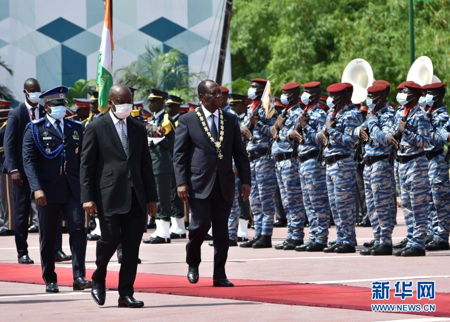 12月14日,在科特迪瓦阿比让,瓦塔拉(前右)宣誓就职后参加检阅仪式。新华社发(伊万·宋摄)