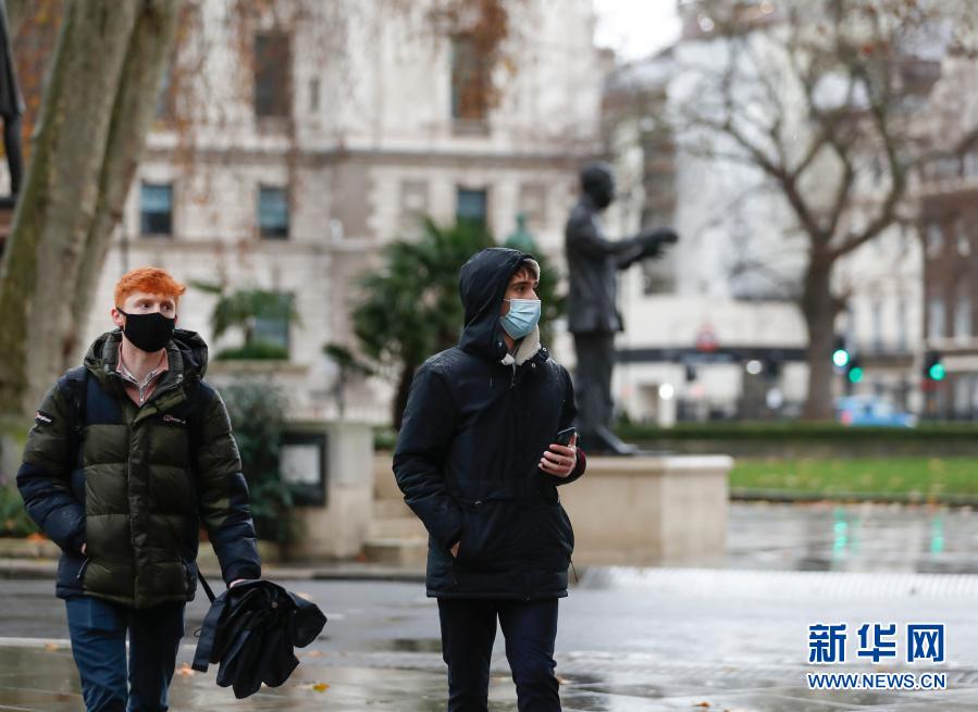 12月13日,戴着口罩的人们在英国伦敦议会广场附近行走。英国政府12月11日宣布,经专家们评估,该国决定将与新冠病毒感染者有密切接触的人自我隔离期从原本的14天缩短至10天。新华社记者韩岩摄