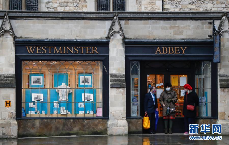 12月13日,戴着口罩的人们在英国伦敦威斯敏斯特教堂前的商店避雨。英国政府12月11日宣布,经专家们评估,该国决定将与新冠病毒感染者有密切接触的人自我隔离期从原本的14天缩短至10天。新华社记者韩岩摄