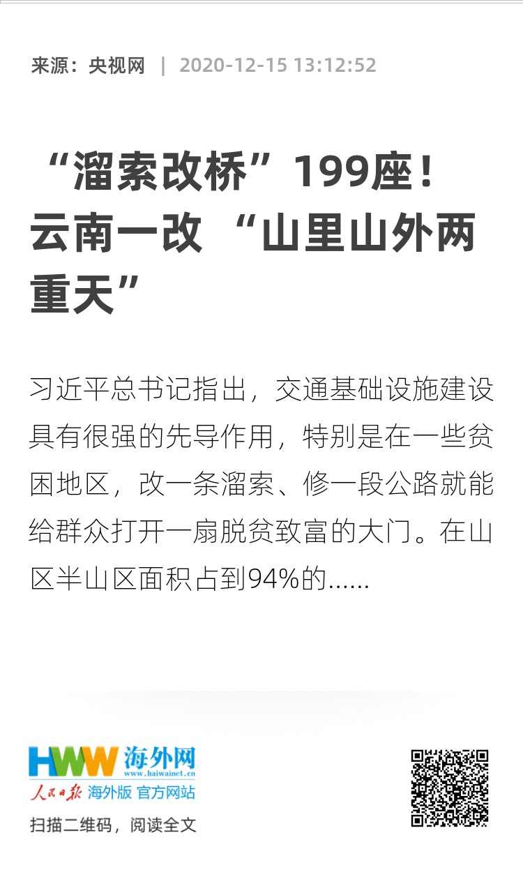 习近平总书记指出,交通基础设施建设具有很强的先导作用,特别是在一些贫困地区,改一条溜索、修一段公路就能给群众打开一扇脱贫致富的大门。在山区半山区面积占到94%的云南省,近年来“溜索改桥”工程彻底结束了山里百姓依靠溜索往来的历史,曾经出行困难的村民们也由此走进了“大桥时代”的新生活。