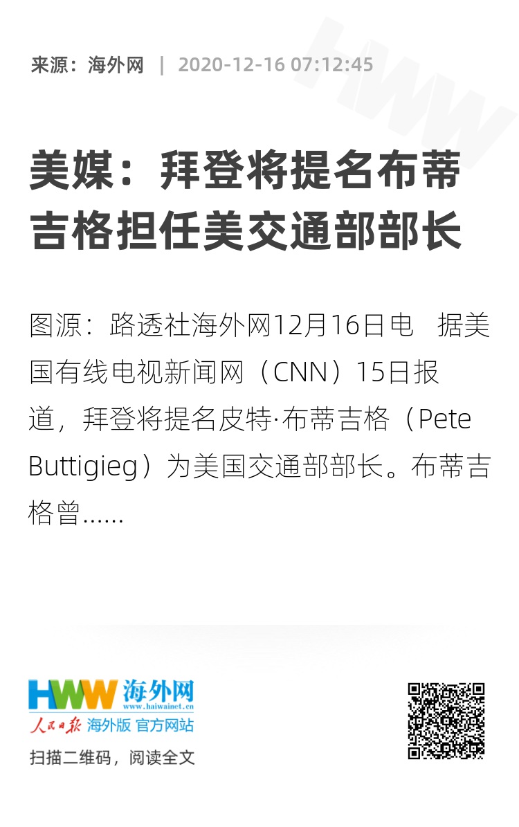 海外网12月16日电 据美国有线电视新闻网(CNN)15日报道,拜登将提名皮特·布蒂吉格(Pete Buttigieg)为美国交通部部长。