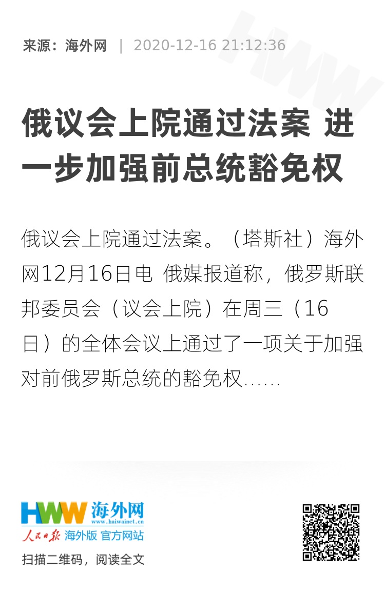 海外网12月16日电 俄媒报道称,俄罗斯联邦委员会(议会上院)在周三(16日)的全体会议上通过了一项关于加强对前俄罗斯总统的豁免权保障的法案。