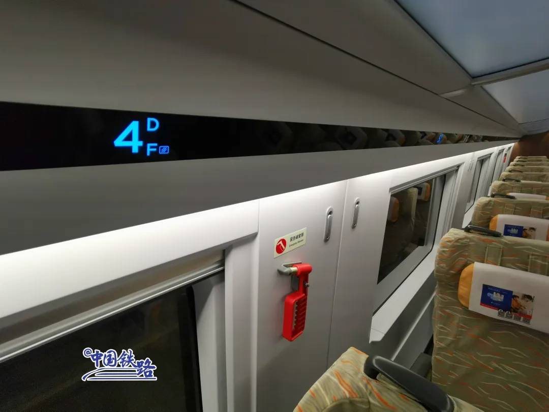 每节车厢内设置了4个温度传感器,智能空调系统让车内温度更适宜。行李架过道边缘增加250个座位显示器,方便旅客查找核对本人座席。
