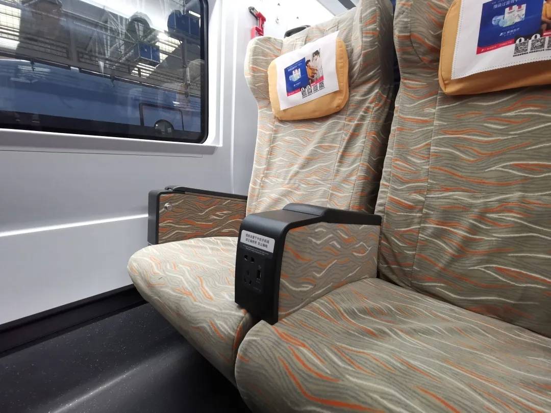 二等3人座椅的两坐垫之间设置2个插座,每个插座面板集成1个三孔、1个两孔、1个USB口电源,旅客使用电子设备更加方便。垃圾箱分为可回收垃圾和不可回收垃圾,更加注重车内环保。