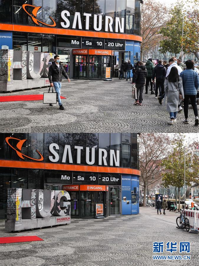 这张拼版照片显示的是德国首都柏林一家商店外11月27日(上)与12月16日的对比。 德国联邦与各州政府13日商定,鉴于该国新增新冠确诊病例数和死亡病例数居高不下,将从16日起进一步收紧疫情防控措施直至明年1月10日。 新华社记者 单宇琦 摄