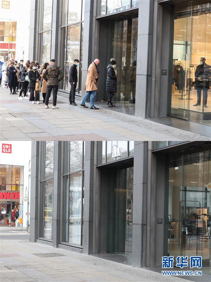 这张拼版照片显示的是德国首都柏林一家商店外11月27日(上)与12月16日的对比。 德国联邦与各州政府13日商定,鉴于该国新增新冠确诊病例数和死亡病例数居高不下,将从16日起进一步收紧疫情防控措施直至明年1月10日。 新华社记者 单宇琦 摄