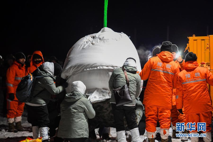 12月17日,工作人员在搬运嫦娥五号返回器。12月17日凌晨,嫦娥五号返回器携带月球样品,采用半弹道跳跃方式再入返回,在内蒙古四子王旗预定区域安全着陆。新华社记者 彭源 摄