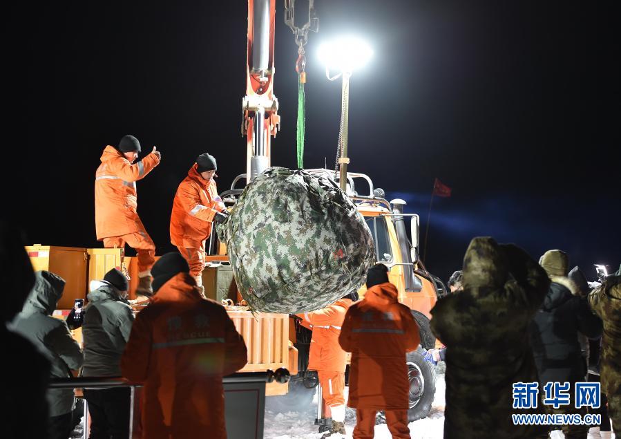 12月17日,工作人员将嫦娥五号返回器吊运至装载车辆。12月17日凌晨,嫦娥五号返回器携带月球样品,采用半弹道跳跃方式再入返回,在内蒙古四子王旗预定区域安全着陆。新华社记者 任军川 摄