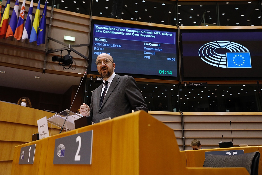 当地时间2020年12月16日,比利时布鲁塞尔,欧洲理事会主席米歇尔在欧洲议会上发表演讲。图片来源:人民视觉/视觉中国
