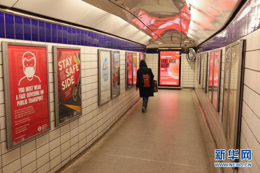 12月16日,行人在英国伦敦的地铁站内行走。英国政府12月14日宣布,鉴于新冠疫情形势变化,决定伦敦以及埃塞克斯郡和赫特福德郡的部分城镇自16日起正式进入最高的三级防控级别。新华社发(蒂姆·爱尔兰 摄)