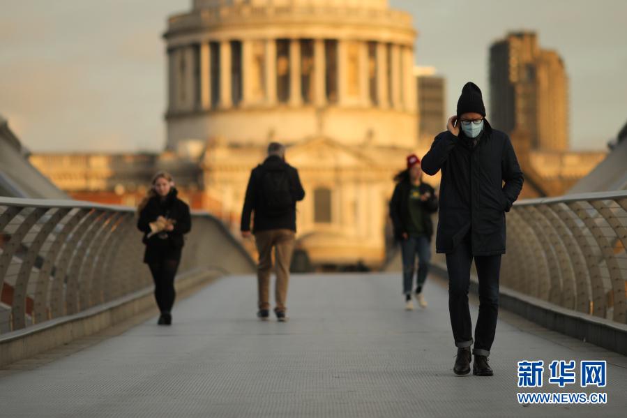 12月16日,行人在英国伦敦的千禧桥上行走。英国政府12月14日宣布,鉴于新冠疫情形势变化,决定伦敦以及埃塞克斯郡和赫特福德郡的部分城镇自16日起正式进入最高的三级防控级别。新华社发(蒂姆·爱尔兰 摄)