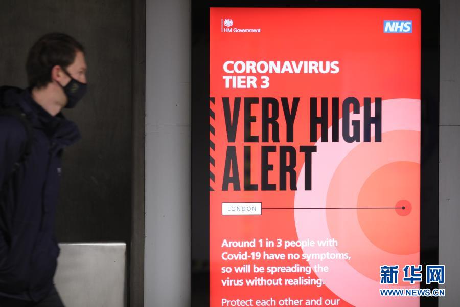 12月16日,一名男子在英国伦敦的滑铁卢车站内行走。英国政府12月14日宣布,鉴于新冠疫情形势变化,决定伦敦以及埃塞克斯郡和赫特福德郡的部分城镇自16日起正式进入最高的三级防控级别。新华社发(蒂姆·爱尔兰 摄)