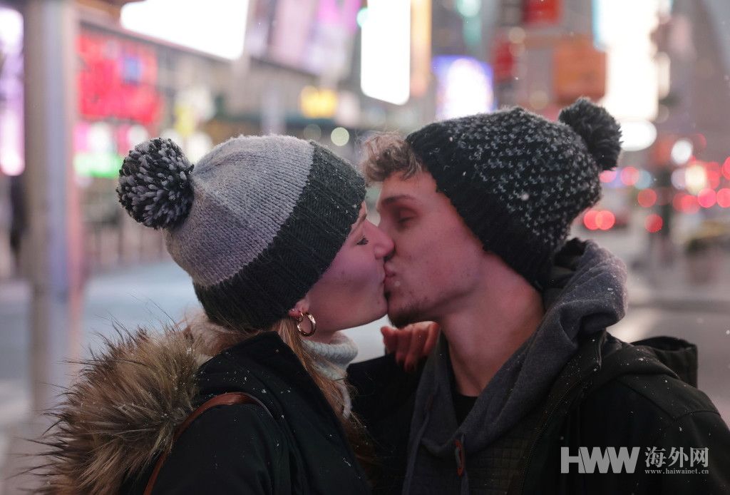 当地时间2020年12月16日,美国纽约,当地迎来大雪,民众在纽约时代广场上玩雪。(供图:东方IC)